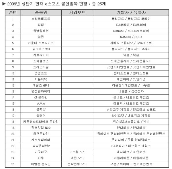 ... 공인종목으로 선정된 게임은 공인대회를 유치할 수 있고 프로게이머를 새롭게 양성할 수 있게 되며 협회에서 주최하는 e스포츠 대회 및 행사에도 우선적으로 참여할 수 있게 되는 등 정식 e스포츠 종목으로써 위상제고 및 각종 제도적 혜택을 누릴 수 있게 된다. 현재 e스포츠 공인종목은