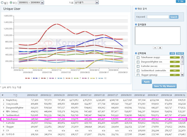 ...co. kr)가 인터넷 리서치업체 코리안 클릭(9월 10일 자료)기준으로 레이싱 게임 1위에 올랐다고 11일 밝혔다. 뿐만 아니라 온라인 게임 종합 6위, 평균 동시 접속자 4만 7천 명, 누적회원 700만 명 돌파 등의 성과를 거두며 게임대작들의 런칭과 경쟁작의 홍수 속에 인기