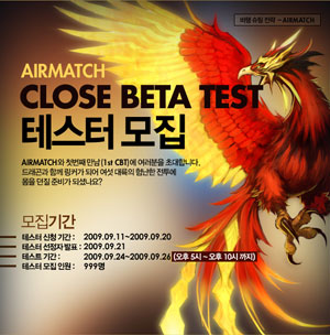 ...co. kr)의 첫 번째 비공개 시범 테스트(이하 CBT)의 테스터를 모집한다. ‘랭커들이여 도전하라’ 라는 타이틀로 실시되는 '에어매치'의 테스터 모집은 11일부터 20일까지 공식 홈페이지를 통해 진행되며, 참여한 게이머들 중 999명의 테스터를 선발하여 CBT에 참여할 수 있