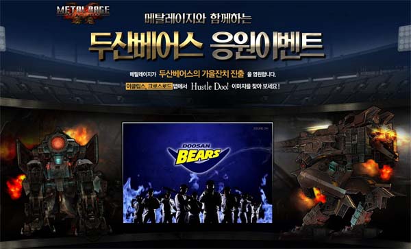 ... 페넌트레이스가 절정에 이르는 9월 한 달, 두산베어스의 홈 경기가 진행되는 잠실 구장에서 <메탈레이지>를 만날 수 있다. <메탈레이지>는 인기 아이템 및 카드 쿠폰 10장 100% 당첨 쿠폰을 현장에서 배포한다. 쿠폰은 메탈레이지 홈페이지에 쿠폰번호를 등