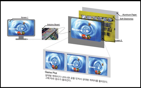 ... MIT 미디어랩의 텐저블 미디어 그룹과 넥슨 에어라이더 개발진이 참여한 연구에서는 주변에서 흔히 볼 수 있는 사물이 온라인게임에 영향을 미치는 방법을 구현하자는 것이 연구과제였다. 현실세계의 스크린을 향해 사물(ex 공, 인형)을 던지는 행위를 통해, 가상세계인 온라인게임 속