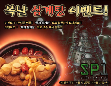 ... 이벤트 기간 동안 게임 내 전 지역에서는 몬스터 사냥을 통해 ‘닭’, ‘인삼’, ‘찹쌀’, ‘마늘’ 등의 복날 아이템을 획득할 수 있는데, 이를 ‘구스펠트’ 광장의 ‘정체불명의 메신저’에게 전달하면 ‘특제 삼계탕 상자’ 아이템을 얻을 수 있다. 특제 삼계탕 상자 아이템을 개봉하