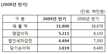 ...co. kr)은 2009년 2분기 매출액 144억2천만원, 영업이익 16억7천만원, 당기순이익 11억6천만원을 기록했다. 상반기 전체로는 매출 319억원, 영업이익 52억1천만원, 당기순이익 38억2천만원을 기록했다