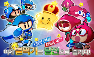 ...com)’에 신규 모드 ‘별먹기 팀전’을 업데이트한다. ‘별먹기 팀전’은 4분의 게임 시간 동안 더 많은 별을 획득한 팀이 승리하는 모드로, 다른 팀원이 보유한 별을 최대한 많이 빼앗는 것이 승리 포인트다. 물방울(버블)에 갇힌 상대방을 터뜨린 후 ‘뿅망치’ 아이템으로 때리거나