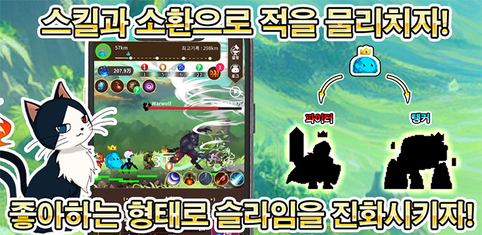 ... 본 게임에서 플레이어는 단순한 슬라임에서 1차, 2차 진화를 거치며 자신만의 캐릭터를 성장시켜 나가는 슬라임 진화 시스템을 통해 단순히 능력치가 상승하는 것에 그치는 것이 아니라 천사나 드래곤 등 완전히 다른 형태와 스킬을 가진 존재로 거듭나게 된다. 이를 통해 매