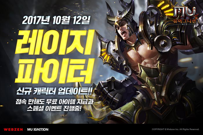 ... 뮤 이그니션의 기존 이용자는 직업 전환 카드를 활용해 ‘레이지파이터’로 캐릭터를 전환할 수 있다. 장착 중인 날개, 대천사의 절대무기 등은 직업에 맞게 전환되며 2차 전직 스킬을 제외한 모든 스킬은 자동으로 학습된다. 웹젠은 모든 서버의 길드 회원들이 참가해 실시간