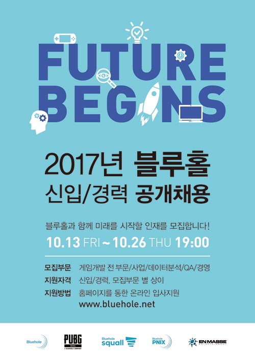... 지원 자격은 각 부문 별로 상이하며 나이, 전공 및 학력에는 제한을 두지 않는다. 전형 절차는 서류 심사, 역량 및 인성 인터뷰 순서로 진행되며, 최종 합격자는 12월 초에 개별 통보된다. 블루홀 김강석 대표는 “블루홀은 게임 제작의 명가를 지향하며 끊임 없이 시장