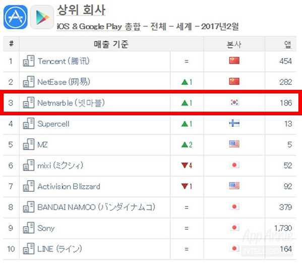 ...장기 흥행 중인 ‘레볼루션’도 지난 1월에 이어 두 달 연속 ‘글로벌 매출 상위 모바일 게임’ 2위를 기록했다. ‘레볼루션’은 첫 달 2,060억이라는 기록적인 매출을 기록한 후 꾸준히 양대 마켓 1위 자리를 유지해왔다. 넷마블은 이달 초 세계 최대 게임 개발자 컨퍼런스 ‘GDC