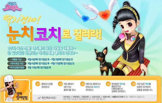 ... 참여방법은 3명 이상의 게이머가 모인 오디션 게임룸에서 오디션을 즐기면 무작위로 제공되는 추억의 놀이도구인 ‘딱지’를 모아, 별도로 마련된 이벤트 페이지에 원하는 수만큼 입찰하는 방식이다. 가장 많이 입찰한 게이머에게 해당 경품이 주어지며, 경매 이벤트가 진행되는 마지막 순