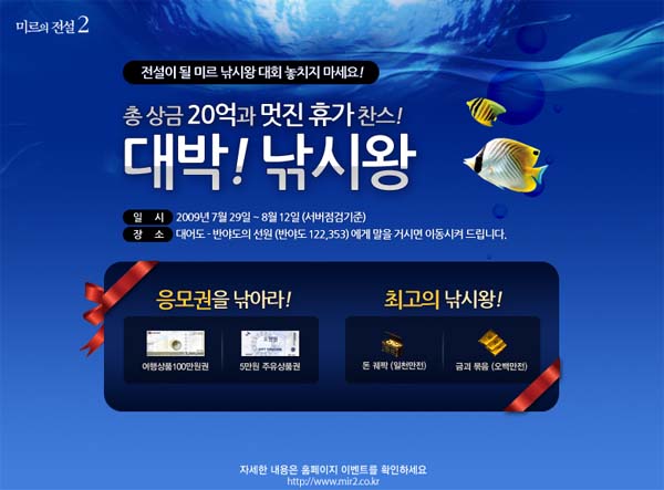 ... 이용자가 잡은 물고기는 종류와 크기에 따라 차등 점수를 적용해 최종 순위에 적용되며, 농어와 메기 등 큰 물고기를 잡을수록 높은 점수를 받을 확률이 높다. 특히, 이벤트 기간동안 제공되는 응모권을 가장 많이 낚은 이용자에게는 ▲여행상품권을 선물하며, 그 외 최고 점수를 획득한