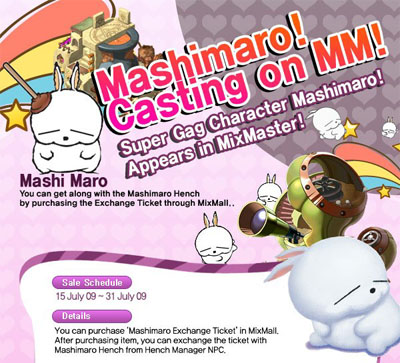 ... 깜찍한 캐릭터와 귀여운 몬스터들로 아기자기하게 구성된 ‘믹스마스터’에서 ‘마시마로’는 특유의 익살스러운 표정과 귀여운 행동으로 게임 내 주인공을 도와 몬스터를 물리치는 펫 ’헨치’의 역할을 한다. 또한 ‘마시마로’가 일반 몬스터 및 보스 몬스터로 등장하는 특별 필드 ‘마시마로