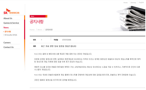 ...V. E'에 대해 개발사 SK아이미디어가지난 7일홈페이지 공지를 통해 공식 입장을 밝혔다. 이 회사는 공지문을 통해 '공개된 영상은 퍼블리셔 대상의 게임소개를 목적으로 제작된 영상으로 게임 자체에 대한 표절 의혹 제기 대상은 아니다'라며 '영화적 요소를 강조한 연출과 캐주얼한
