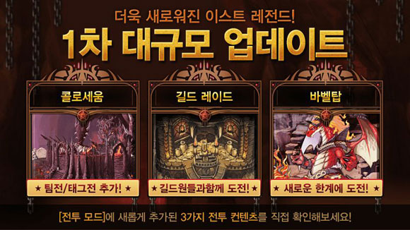 ... 팀 매치는 4인 파티로 최대 3개 팀을 편성한 후 3판을 모두 이기면 전투가 종료되는 방식으로 진행되며, 태그 매치는 최대 3명의 영웅으로 1대1 태그 매치를 진행해 상대방 영웅 3명을 모두 제압하면 승리하는 방식이다. 또 50개 층으로 구성된 '바벨탑'과 속성에 따라 5개의