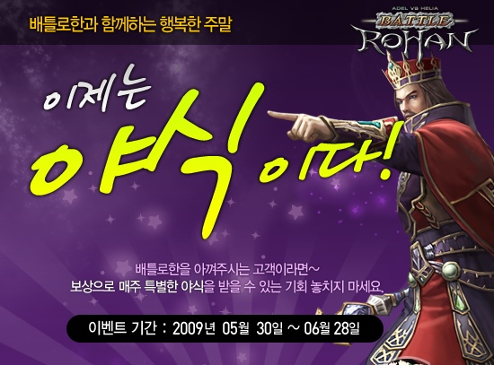 ...[정책/자료] ㈜YNK코리아(대표 장인우)는 '로한'을 기반으로 개발된 전투 중심 '배틀로한'이 공개 서비스 이후주말 저녁 배틀을 즐기는 열혈 유저를 위해 미션 달성 시 푸짐한 야식을 제공하는 이제는 야식이다 이벤트를 진행한다. '배틀로한'은 오는 6월말까지 총 6회에 걸쳐 매