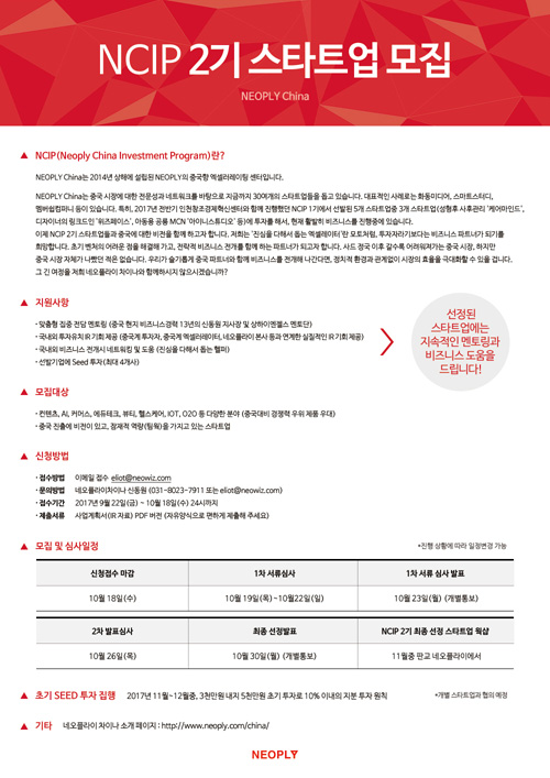 ... 이번 NCIP 2기의 대상 분야는 콘텐츠, AI, 커머스, 에듀테크, 뷰티, 헬스케어, IOT, O2O 등이다. 비전 있고, 잠재적 역량을 가진 스타트업이라면 누구나 신청 가능한 NCIP 2기의 신청은 사업계획서를 작성해 오는 10월 18일(수) 자정까지 이메일로(eli