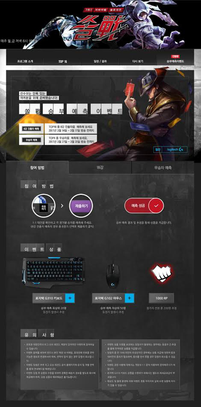 ... 예선 및 본선 경기는 인터넷 방송을 통해 3월 3일부터 매주 월, 금요일 오후 8시에 방영되고 있다. 오는 31일까지 진행되는 이번 프로모션은 8강 진출자 예측과 우승자 예측으로 2회 진행된다. 8강 진출자 예측은 3월 14일부터 17일 오후 8시 방송 직전까지 진행되며 TOP