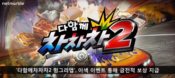 ... 이번 이벤트는 '차차차 자로 끝나는 말은?'으로 '다함께차차차2 헝그리앱' 커뮤니티에 이벤트 기간 동안 제목에 '차' 자로 끝나는 단어가 들어간 게시글 5개를 작성하면 된다. 참가자 전원에게는 헝그리앱 내에서 현금처럼 사용할 수 있는 밥알 포인트를 지급한다. 본 이벤트는