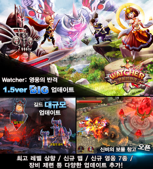 ... 이 시스템은 자신의 광산에 수비 영웅을 주둔시켜 보물을 보호하고, 약탈을 통해 타 플레이어의 아이템을 획득할 수 있다. 이와 함께 ‘왓쳐’는 최대 레벨을 80으로 상향 조정한다. 이에 따라 새로운 스토리의 맵 2종이 추가되며, 신규 맵에서는 주황색 두루마리 조각(전갈, 사수