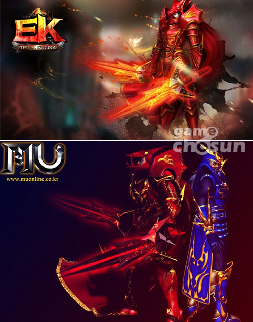 ... 표절 의혹을 사고 있는 캐릭터는 전체적으로 붉은색 계통의 갑옷을 입고 있으며 독특한 형태의 쌍검을 들고 있다. 일부 게이머들은 EK가 '뮤온라인'과의 표절을 피하기 위해 캐릭터가 들고 있는 쌍검과 전체 배경에 화려한 효과를 입히는 등 표지 디자인에 변화를 줬다고 의혹을 표명