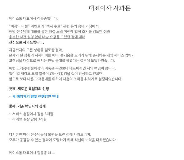... 이어 "이번 고객응대 절차상의 미숙은 무엇보다 대표이사인 저의 책임이 크다"며 "입이 열 개라도 드릴 말씀이 없는 상황임을 깊이 반성하고 있다"고 거듭 사과했다. 김 대표는 이번 논란의 책임을 물어 서비스 총괄이사와 라이브 실장에게 각각 3개월의 감봉 조치를 내렸고 대표이사