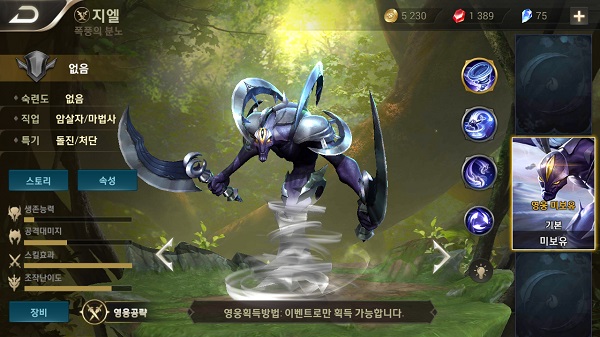 ... 그뿐만 아니라 적을 추격할 때 이동속도가 빨라지는 패시브 '추적의 달인'을 보유하고 있어 한 번 포착한 적은 쉽게 놓치지 않는다. 클린히트 시 둔화+기절+체력회복 기능을 모두 발휘하는 스킬 '배트랑', 주변 적을 모두 공격하되 주시 대상에게 추가 피해를 입히는 '회오리검' 덕
