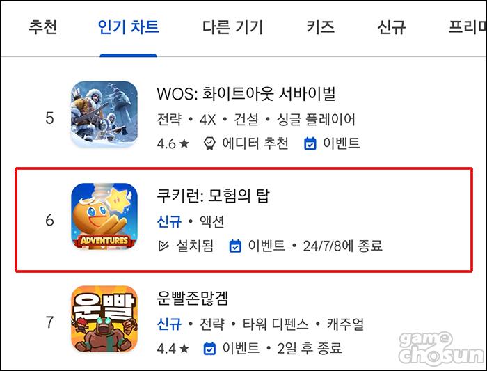 ... 쿠키런: 모험의 탑은 해외에서도 주목받고 있다. 사전 다운로드가 시작된 출시 하루 전25일에는 한국뿐만 아니라 미국과 캐나다 등 북미 애플 앱스토어에서도 게임 인기 순위 1위에 등극하며 쿠키런 인기를 입증했다. 이밖의 지역에서도한국어, 영어, 대만어(번체), 태국어, 프