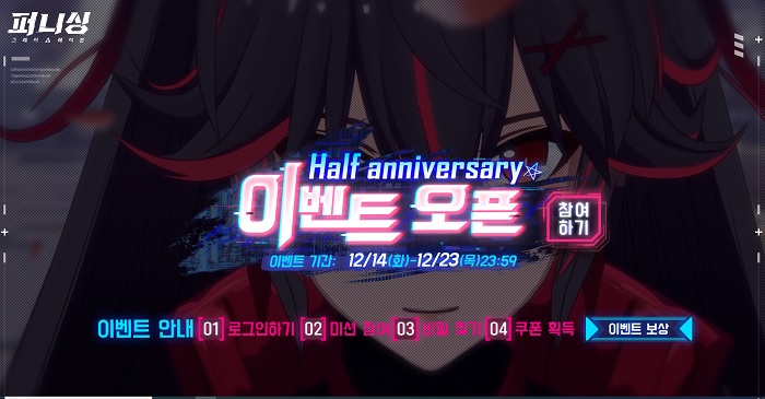 ... 그동안의 퍼니싱 이벤트가 게임 내에서 모두 진행된데 반해 이번 하프애니버셔리는 이벤트 웹페이지(https://grayraven. kr/halfanniv/)에서 진행된다. 해당 페이지 내에서 로그인을 진행한 후 이벤트에 참여해 '쿠폰' 형식으로 아이템을 받을 수 있