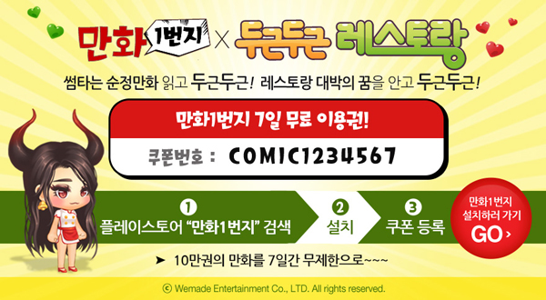 ... 또한, 6월 1일부터 14일까지는 만화 1번지의 서비스를 이용할 수 있는 7천원 상당의 월정액권을 구매한 이용자 2천명에게 두근두근 레스토랑 게임에서 사용 가능한 루비 100 및 추가 아이템을 증정하는 이벤트를 실시한다. 한편, 지난 2월 공식 오픈 한 ‘만화 1번지’는