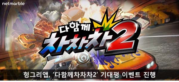 ... 이번 미션은 '다함께차차차2 기대평 남기고 밥알 받아가자'로 '다함께차차차2 헝그리앱' 커뮤니티에 이벤트 기간 동안 기대평을 남기면 참가자 전원에게 헝그리앱 내에서 현금처럼 사용할 수 있는 밥알 포인트를 지급한다. 본 이벤트는 게임 출시 전까지 진행되며 자세한 내용은 '헝그