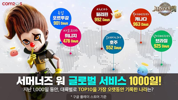...특히 963일간 캐나다의 차트 상위권을 점령해온 ‘서머너즈 워’는 한국 모바일 게임으로는 최초로 세계 최대 수준의 모바일 게임 시장인 미국에서 전체 서비스 기간 중 절반이 넘는 541일 동안 TOP10을 달성했다. 더불어 아시아에서는 전체 기간 중 99%가 넘는 총 992일간 필리