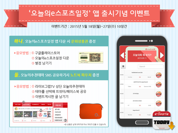 ... 이에스게임즈는 이번 앱 출시 기념으로 구글 앱 스토어에서 ‘오늘의e스포츠일정’ 앱을 다운로드 한 뒤 앱 평가하기 글을 작성한 사용자 중 추첨을 통해 문화상품권을 제공한다. 이와 더불어 라이브그랩TV 내 '오늘의추천테마' SNS 공유하기 이벤트가 동시에 진행된다. 사용자는