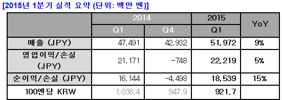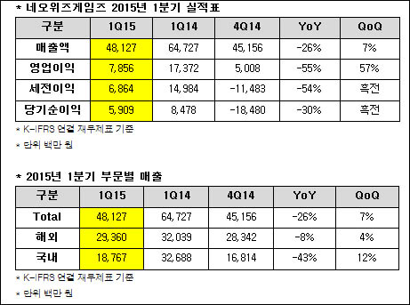 ... 2015년 1분기는 중국 춘절 성수기 영향으로 해외 매출이 소폭 상승했고 국내 매출 상승은 기존 게임들의 매출 유지에 기인했다고 회사 측은 전했다. 네오위즈게임즈는 2분기 중 PC 온라인게임 ‘애스커’의 2차 비공개 테스트를 실시하고 모바일 RPG(역할수행게임) '퓨
