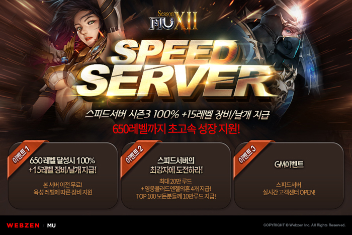 ...5배, 3배씩 상승시켜주는 등 게이머들에게 보다 빠른 레벨업 환경을 제공한다. 웹젠은 '스피드 서버 시즌3'에서 캐릭터 레벨 600을 달성한 후 정식 서버로 이전한 게이머 전원에게 1개월 풀 캐시 아이템과 한정판 '티베톤 뮨'을 제공한다. 또, 650레벨을 달성 후 이전할