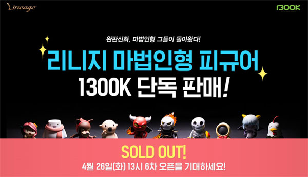 ... '리니지 마법인형 피규어'는 지난해 12월 엔씨소프트의 대표 온라인게임 '리니지' 출시 17주년을 맞아 기획된 상품으로 벌써 3번째 판매가 진행 중이다. 3차 판매는 개시 첫날 약 7분 만에 1만 개의 초도 물량을 모두 소진하는 기염을 토했다. 이후에도 피규어의 인기는