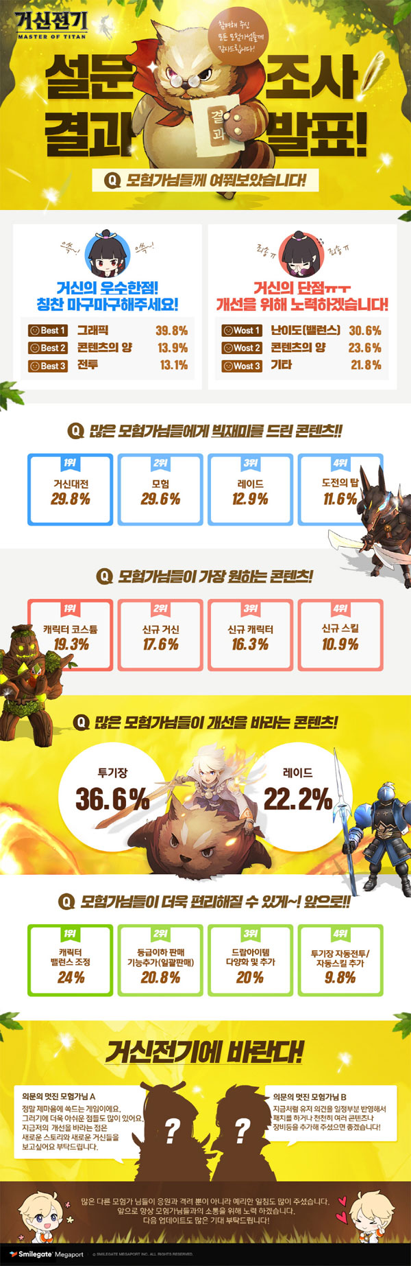 ... 설문조사결과에 따르면 전체 이용자 중 약 40%가 '거신전기'의 우수한 점으로 그래픽을 꼽았다. 이어 콘텐츠의 양, 다양한 전투 시스템 순이었다. 또 약 30%의 이용자들이 플레이를 하면서 가장 큰 재미를 준 콘텐츠로 거신대전과 모험을 선택했다