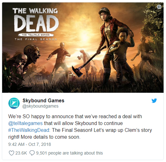 ... 지난달 '워킹데드: 더게임시리즈'의 제작사인 텔테일게임즈가 스튜디오 대부분을 폐쇄하고 직원 여러명을 해고하는 등 게임 개발에 난황을 겪을 만한 상황이 돼, 올해 출시 예정이었던 '워킹데드: 더게임 시리즈' 출시가 불투명해진 바 있다. 이에 스카이바운드가 나서서 개발