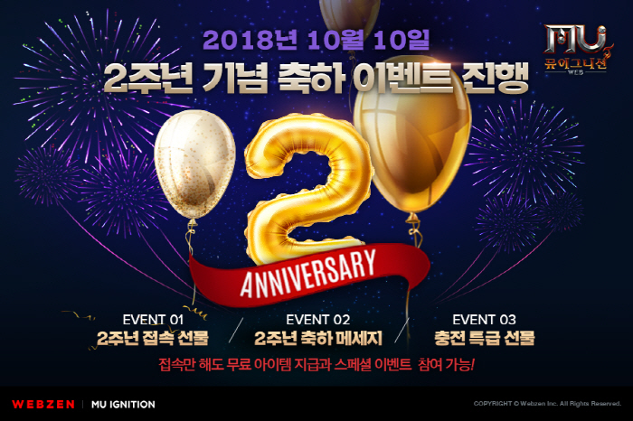 ...10월 19일까지는 ‘2주년 축하 메시지 이벤트’가 진행된다. 이벤트 기간 동안 ‘뮤이그니션’ 공식 홈페이지 자유게시판에 방문해 ‘2주년 축하’를 제목으로 게시글을 작성하면, 추첨을 통해 총 20명에게 ‘귀속 다이아 2000개’를 선물로 준다. 이외에도 일정 다이아 충전 시 최대