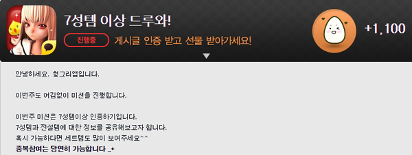 ... 세 번째 이벤트는 'PVP 인증글에 댓글 달자'로 'MXM 헝그리앱' 'PVP카테고리'에 등록된 인증 글에 댓글을 작성하면 추첨을 통해 헝그리앱 내에서 현금처럼 사용할 수 있는 밥알 포인트를 제공한다. 네 번째 이벤트는 '마스터 인증 카테고리에 댓글 달자'로 'MXM