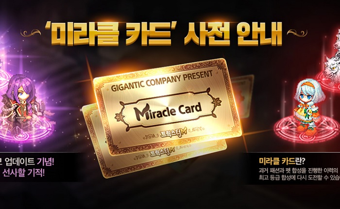 ... 트레저 가디언 사전예약과 함께 공개된 이번 미라클 카드는 총 2장을 획득할 수 있다. 카드 효과는 과거에 패션, 펫을 합성한 최대 이력에 해당하는 소환을 한 번씩 진행할 수 있는 효과다. 예를 들어 희귀 4개를 모아 영웅 등급에 도전한 유저라면 희귀-영웅 등급의 아이템을