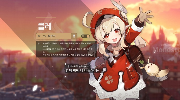 ...기대에 부응하듯 벤티픽업 뽑기가 끝난 후 다음 픽업 캐릭터로등장했다. 픽업 뽑기를 통해 마침내 직접 플레이 해볼수 있는 캐릭터로 등장했다 = 게임조선 촬영 원신에서 불 속성은 대미지 증폭 반응 2종(증발, 융해)과 추가 대미지 반응 2종(초전도, 연소)를 일으킬 수