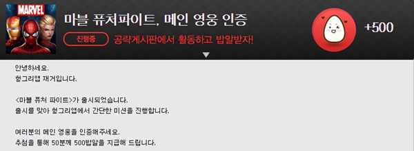 ... 본 이벤트들은 5월 6일까지 진행되며 자세한 내용은 ‘헝그리앱 미션’ 또는 ‘마블 퓨처파이트 헝그리앱’ 이벤트 공지를 통해 확인할 수 있다. 자료 출처 :헝그리앱(http://www. hungryapp