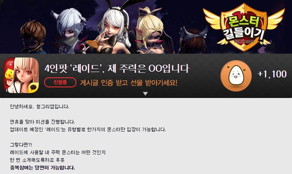 ... 본 이벤트는 5월 6일까지 진행하며 자세한 내용은 ‘헝그리앱 미션’ 또는 ‘몬스터길들이기 헝그리앱’ 커뮤니티 이벤트 공지를 통해서 확인할 수 있다. 자료 출처 :헝그리앱(http://www. hungryapp