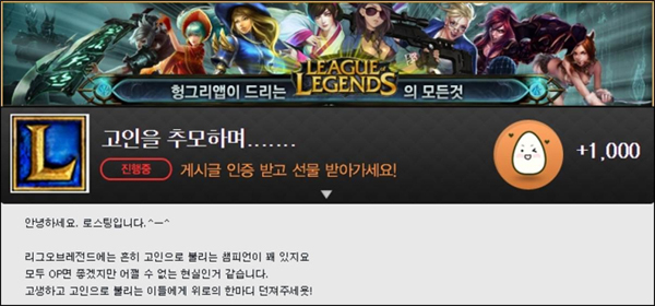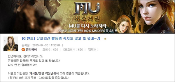 ... 먼저 ‘뮤 오리진 헝그리앱’은 커뮤니티 오픈과 동시에 에픽 아이템을 지급하는 ‘뽑기 쿠폰’을 지급하여 유저들의 큰 관심을 끈 데 이어, 본인 소개, 활동왕, 강화왕, 길드 소개, 공략왕 등의 이벤트로 게임 아이템, 문화상품권, 구글플레이 기프트카드 등을 지급했다.