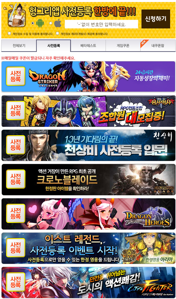 ... 최근 헝그리앱 사전등록 서비스는 참여자가 급증하며 트래픽이 몰려 서버가 다운돼 무료 쿠폰 서비스가 일시적으로 중단되는 해프닝을 겪은 바 있다. 이제 헝그리앱측은 서버 증설을 완료하고, 현재 UI와 DB 설계를 완전히 개편 중에 있으며 5월 중에 대대적인 업그레이드를 진행