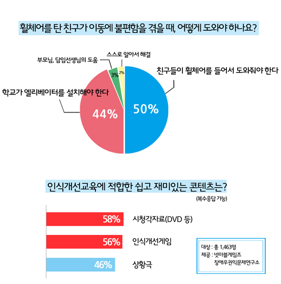 ... 더불어‘장애인은 일반 학생들과 같은 학교에 다니는 것이 좋다’(79%), ‘장애인은 사회 속에서 살아가야 한다(92%)’ 등 장애 비장애 통합교육 및 공동생활에 대해선 긍정적 반응을 보였다. 한편 넷마블은 오는 22일까지 장애인 인식개선 프로젝트 '2015 장애인권교육용