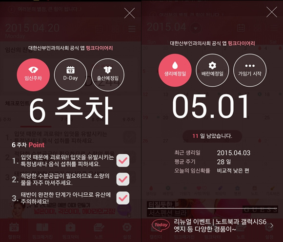 ... 이용자는 설정 화면에서 PAYCO(페이코) 아이디로 로그인한 후 백업하기 버튼만 누르면, 다른 모바일 기기에서 접속하더라도 기존에 입력했던 데이터를 그대로 불러올 수 있다. 또한 시작 화면에 해당 일자를 기준으로 생리예정일, 배란예정일, 가임기 시작일, 오늘의 임신 확률 등