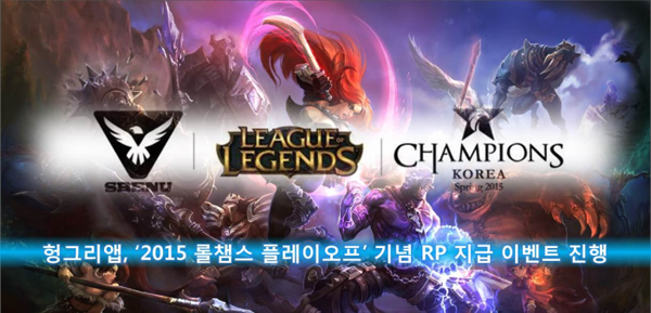 ... 두 번째 이벤트 '펜타킬 나오나요'는 롤챔스 경기에서 '펜타킬' 달성이 예상되는 선수와 그 이유를 '리그오브레전드 헝그리앱' 커뮤니티에 작성하면 추첨을 통해 '리그오브레전드 650RP'를 지급한다. 세 번째 이벤트 '미래에서 왔습니다. '는 롤챔스 시작 전까지 승리