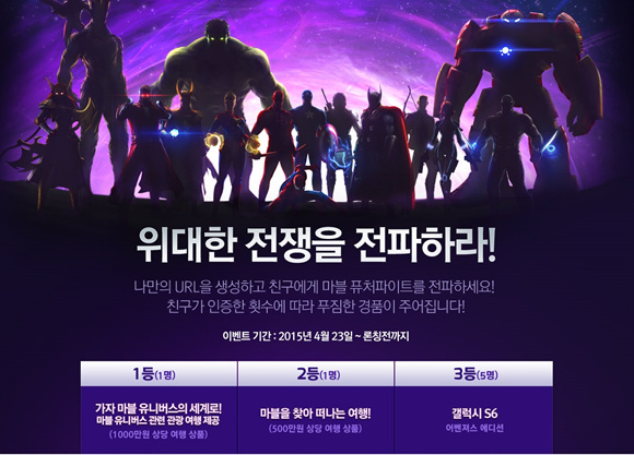 ... 이벤트는 4월 23일부터 출시 전까지 진행되며, 자기만의 URL을 생성하고 그 URL을 페이스북, 카카오톡, 블로그 등에 전파하는 내용이다. 전파횟수에 따라 경품이 지급되며 1등에게는 천만원 상당의 캐나다 캘거리 여행상품, 2등에게는 5백만원 상당의 미국 캘리포니아 디즈니랜