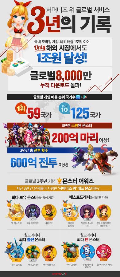 ... 이는 국내 모바일 게임 사상 최초이며, 국내의 모든 게임을 통틀어도 최단 기간 달성 기록이다. 실제로 컴투스는 ‘서머너즈워’ 글로벌 서비스를 시작한 지난 2014년 3분기부터 매 분기 해외 매출 80% 이상을 꾸준히 지속해왔다. ‘서머너즈워’가 해외에서만 1조 원 매출을 거두며