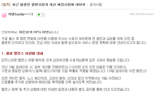 ... 하지만 구글 출시 이후 게임 내 서버 접속 장애와 재화 밸런스 하향 등 여러 차례 미숙한 운영을 보이며 이용자들의 공분을 샀다. 이에 개발사는 21일 '아덴' 공식 카페를 통해 "구글 출시 후 많은 변화로 아덴을 이용해 주시는 수호자 여러분께 큰 혼란과 심려를 끼쳐 드린 점
